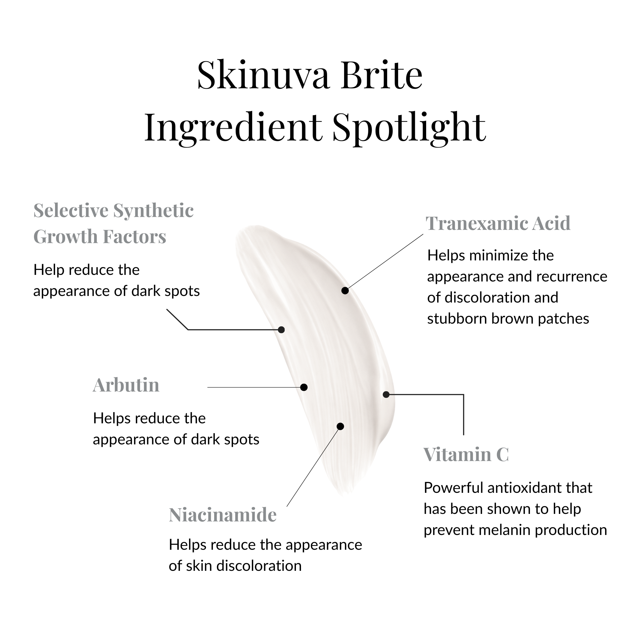 Our studies have shown that Skinuva Brite has helped improve the appearance of various types of hyperpigmentation on the face and body including melasma, post-inflammatory hyperpigmentation, sun spots, and under eye pigmentation*.