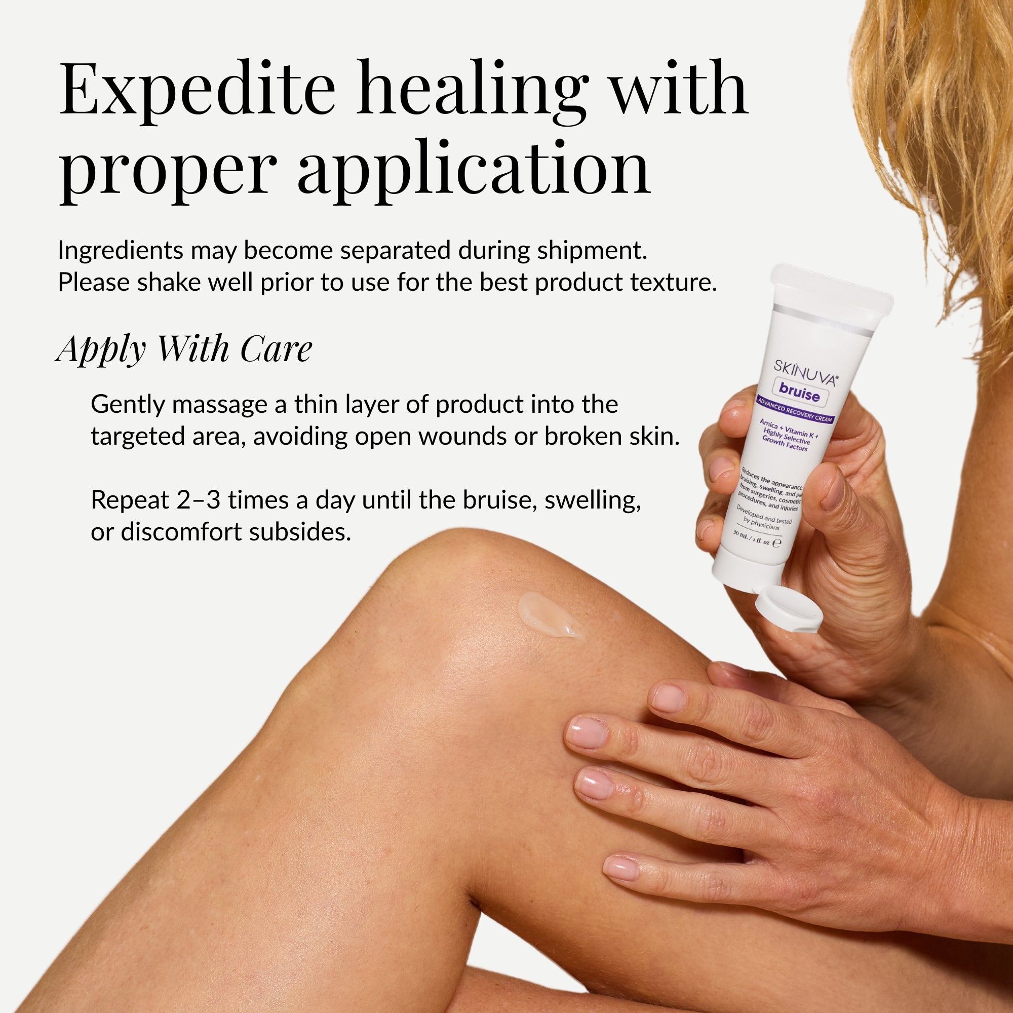 Skinuva Bruise Advanced Recovery Cream (ARC) moisturizes, soothes, and restores the skin, leaving no greasy residue behind. Skinuva Bruise ARC can be applied to help expedite the healing process after surgeries, cosmetic procedures, or injuries. It may be applied to a bruised, swollen, or painful area of the skin where no open wound or other skin irritation is present. Our team of scientists and clinicians have hand-selected clinically proven ingredients to help facilitate healing and leave the skin hydrated.