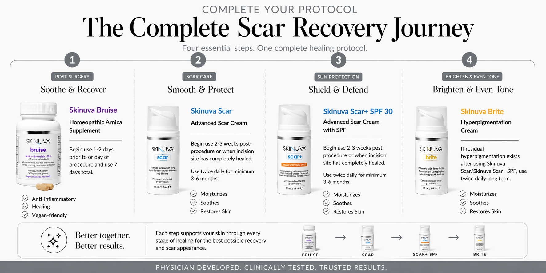 It is recommended to begin using Skinuva 2-3 weeks post-procedure or when the incision site has completely closed. For optimal results, apply Skinuva Scar twice a day, morning and night, on clean, dry skin for at least 3-6 months. Sunscreen and cosmetics may be worn over.